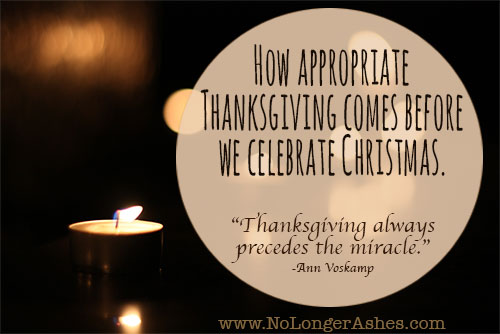 In Ann Voskamp’s book, One Thousand Gifts, she says, “Thanksgiving always precedes the miracle.”